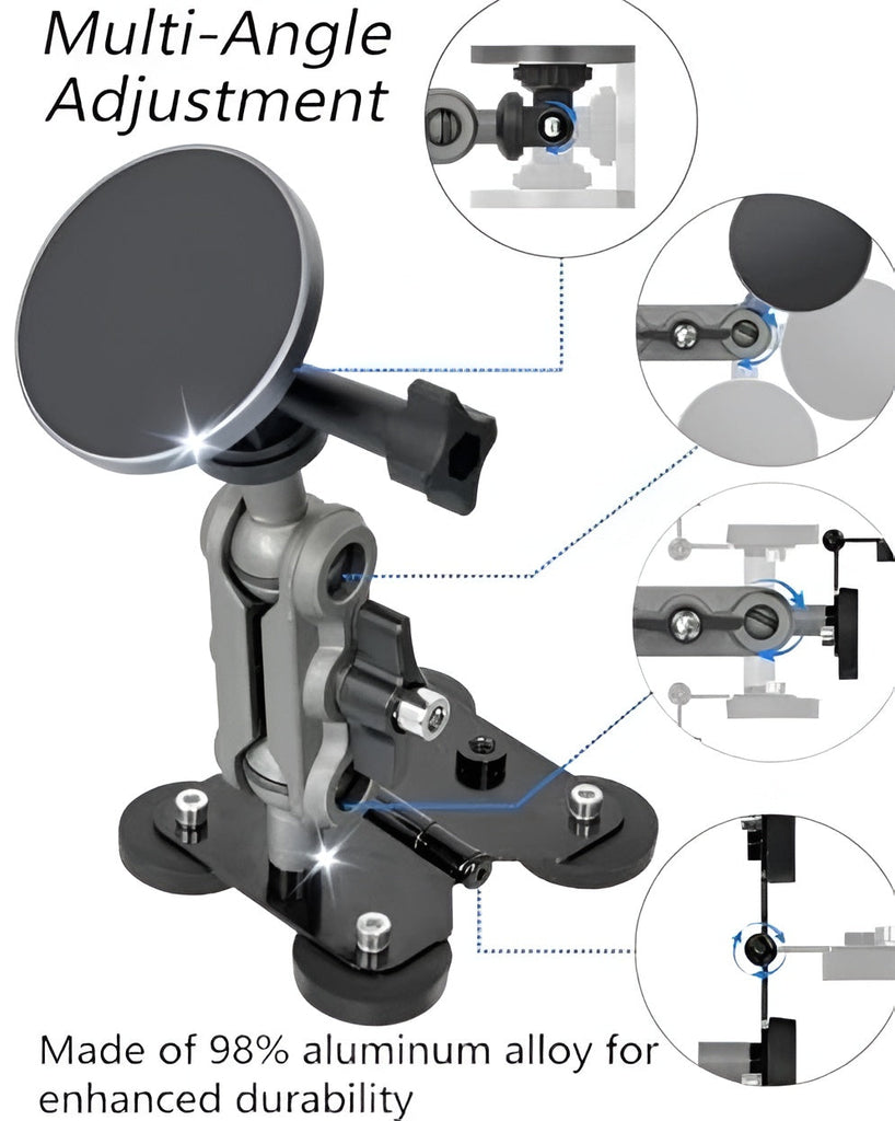 A compact, foldable design allows easy installation on skid steer frames, cabins, dashboards, and other flat or structural metal surfaces.